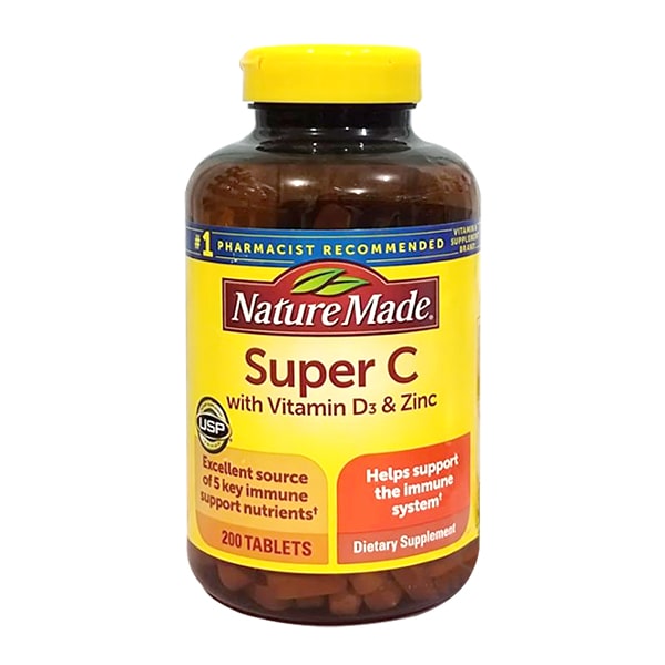 Giới thiệu viên uống vitamin Super C With D3 & Zinc Nature Made:Viên uống tăng cường miễn dịch Super C With D3 & Zinc của Nature Made sản xuất đạt chuẩn USP. Sản phẩm có công thức kết hợp vitamin C, D3 và kẽm, cùng Vitamin E, A hỗ trợ...